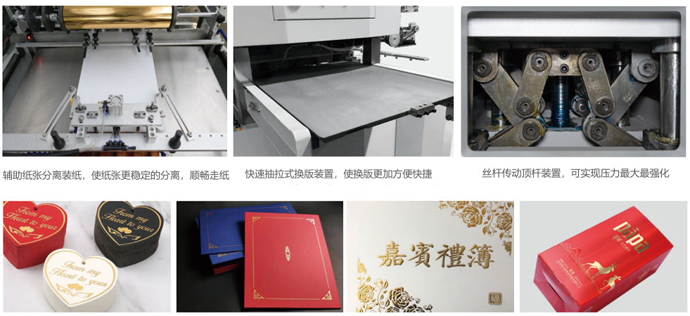 本机适用于将电化铝烫印到各种纸品上,各种高级精细的印刷品,可在本机上进行凹凸烫印平面烫印,以获得富有立体感、精致美观的包装、装潢制品,走纸压力伺服控制,操作简单快捷。